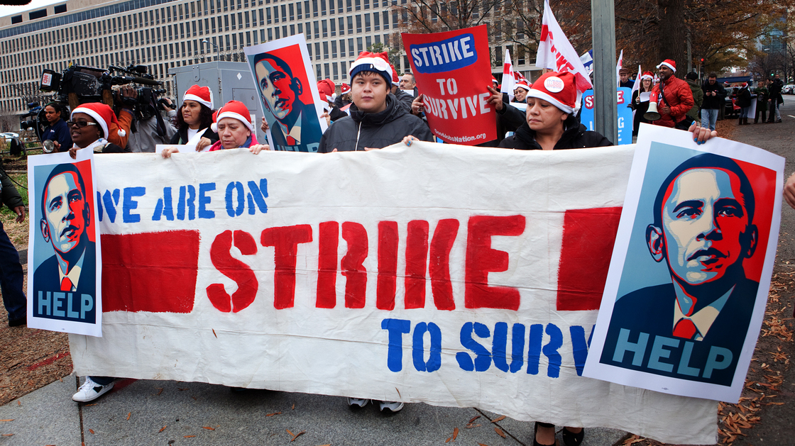 Fast-food workers march towards the Smithsonian’s National Air and Space Museum in Washington, D.C., on Thursday. Similar rallies occurred in about 100 cities across the U.S.